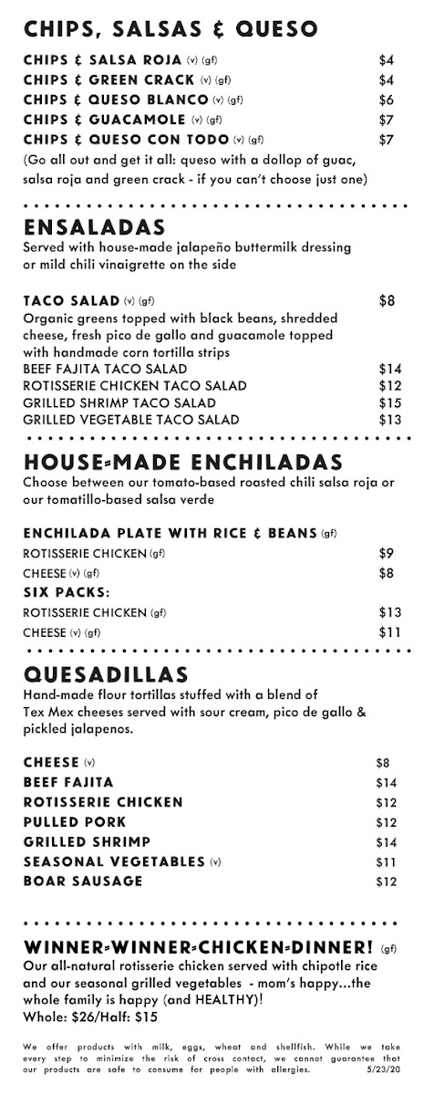 Go all out and get it all: queso with a dollop of guac, salsa roja and green crack- if you can't choose one.