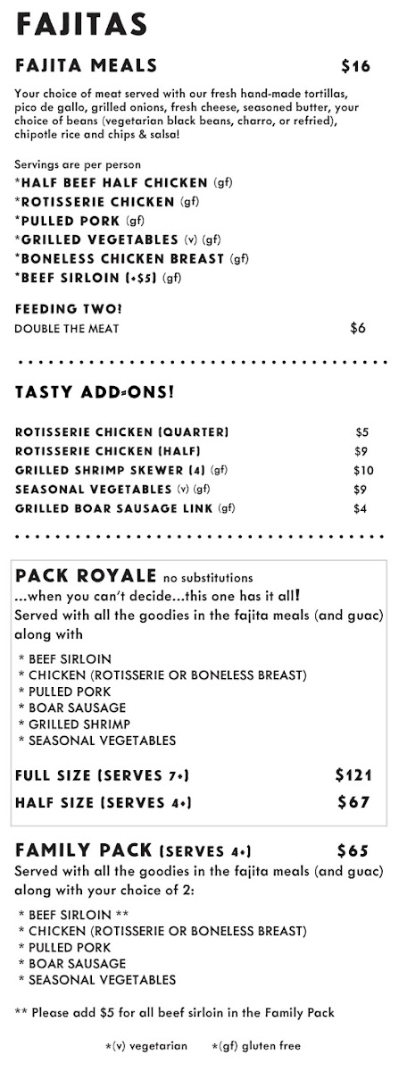 served with all the goodies as the fajita meals along with your choice of 2 of the following: BEEF SIRLOIN BONELESS CHICKEN BREAST, BOAR SAUSAGE OR GRILLED VEGETABLES SERVES 4+