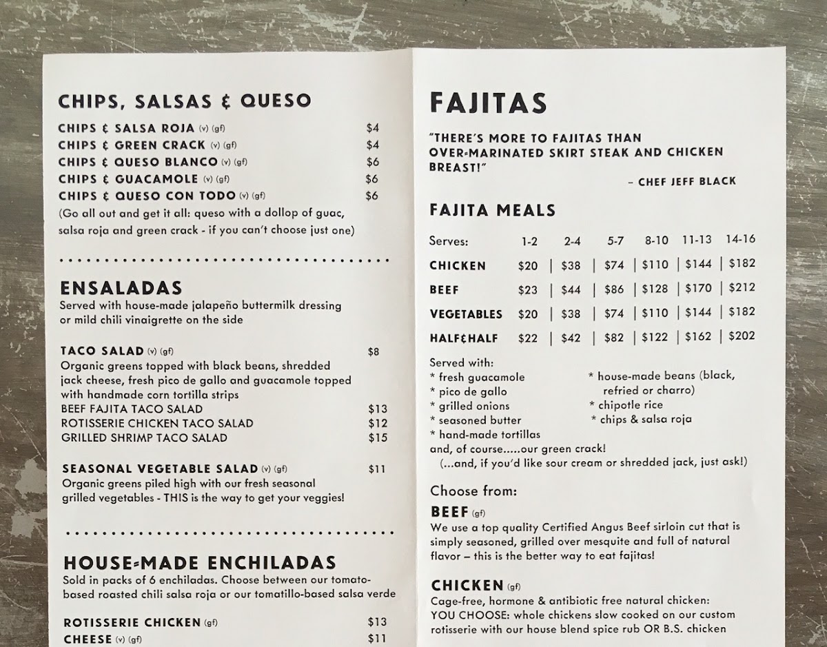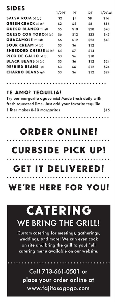 As a concluding look at the menu of Fajitas A Go Go at 3773 Richmond Ave. UNIT 1C, Houston, the overall impression is one of variety, convenience, and a clear focus on classic Tex-Mex flavors done right. The menu starts strong with crowd-pleasing appetizers like Chips & Salsa Roja (V) (Gf), Chips & Green Crack (V) (Gf), Chips & Guacamole (V) (Gf), and indulgent options such as Chips & Queso Con Todo (V) (Gf) and Chips & Queso Blanco (V) (Gf), setting the tone for a satisfying meal. The heart of the menu lies in the fajita offerings, where staples like Boneless Chicken Breast Fajitas (Gf), Beef Sirloin Fajitas (Gf), Half Beef / Half Chicken Fajitas (Gf), and the vegetarian-friendly Grilled Vegetables Fajitas (V) (Gf) showcase both flexibility and bold flavor. For something a bit more handheld, the quesadilla section delivers with Grilled Vegetable Quesadilla (V), Cheese Quesadilla (V), Chicken Fajita Quesadilla, Beef Fajita Quesadilla, and Grilled Shrimp Quesadilla. Lighter but still filling options are found in salads like Taco Salad, Beef Fajita Taco Salad, Grilled Chicken Fajita Taco Salad, Grilled Shrimp Taco Salad, and Grilled Vegetables Taco Salad. Thoughtful sides such as Pico De Gallo (V) (Gf), Fresh Jalapeños (V) (Gf), Pickled Jalapeños (V) (Gf), (12) Flour Tortillas, and Queso Con Todo (V) (Gf) round out the experience, while beverages like Mexican Coke, Topo Chico, Jarritos, and Bottled Water keep things refreshing. To elevate take-out dining, Frozen Margarita (Contains Alcohol), Frozen Margarita - 1/2 Gallon (Contains Alcohol), Frozen Paloma (Contains Alcohol), and Frozen Paloma - 1/2 Gallon (Contains Alcohol) add a festive touch, and larger group options such as Family Pack, Pack Royale (Full), and Pack Royale (Half) make the menu feel complete and well-suited for any occasion.